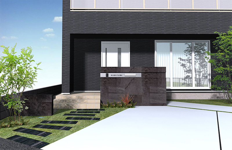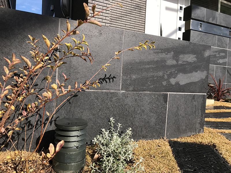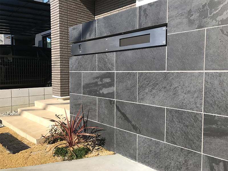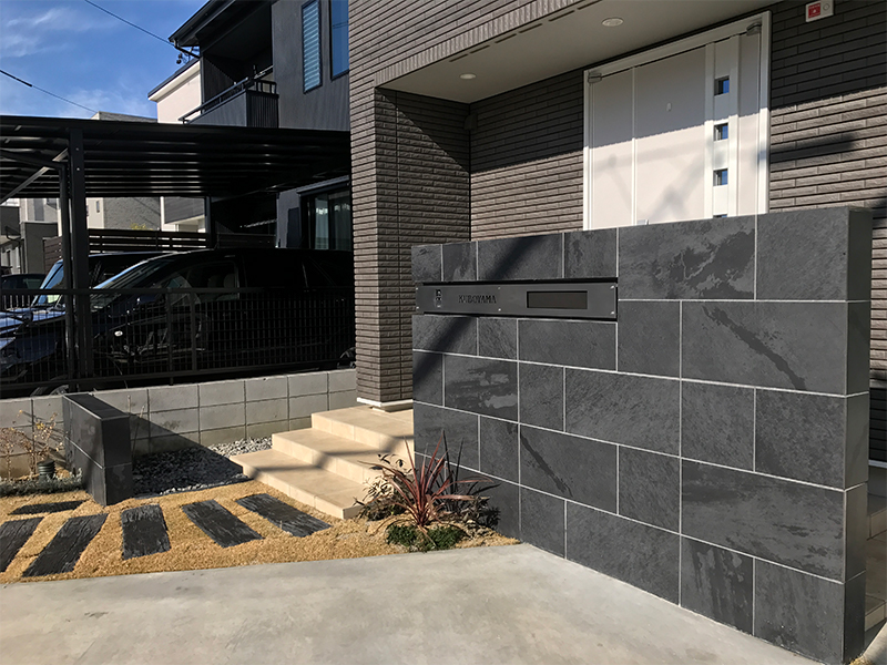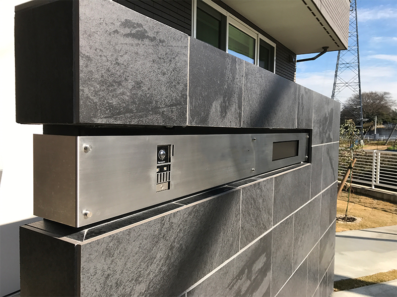 イタリア産の重厚感溢れるタイルにステンレスのオーダー表札でシャープなラインを。