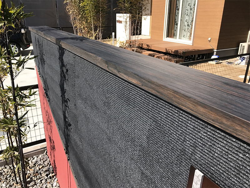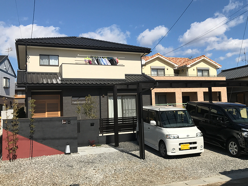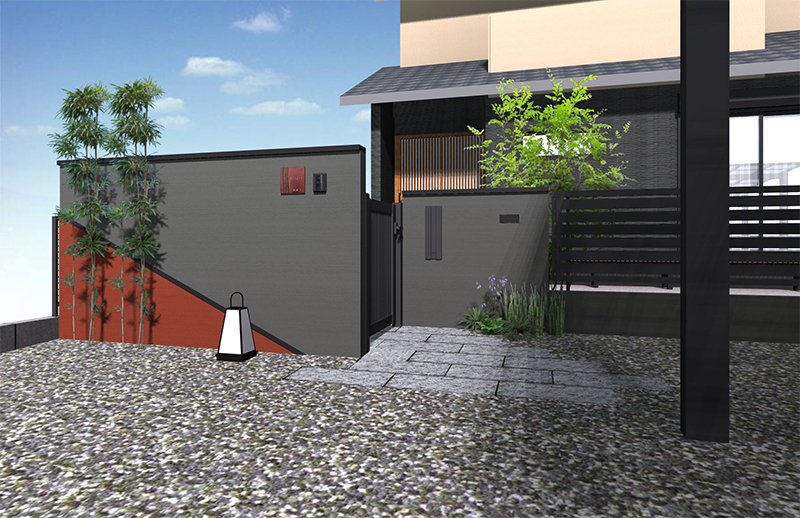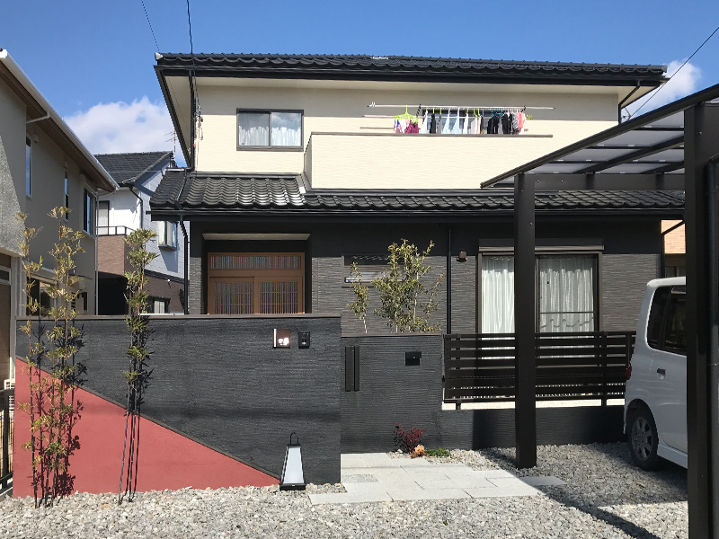 門柱には、差し色で使用したオリジナルオーダーの赤いジョリパットで、昭和レトロな雰囲気を出しつつも、黒で引締めた和モダンスタイル。