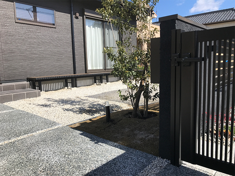 石材(平板)と黒竹と植栽と照明でどこか温かみのある、ほっとする外構。 「昼の雰囲気も好きだけど、夜はもっと好き」と嬉しいお言葉も頂きました。