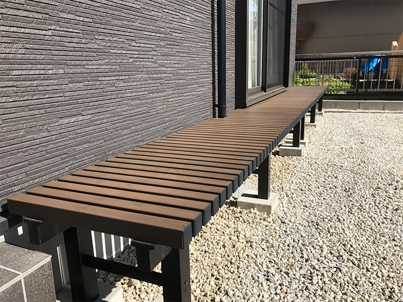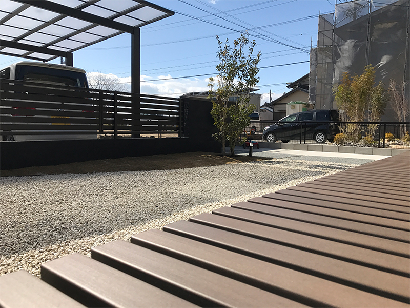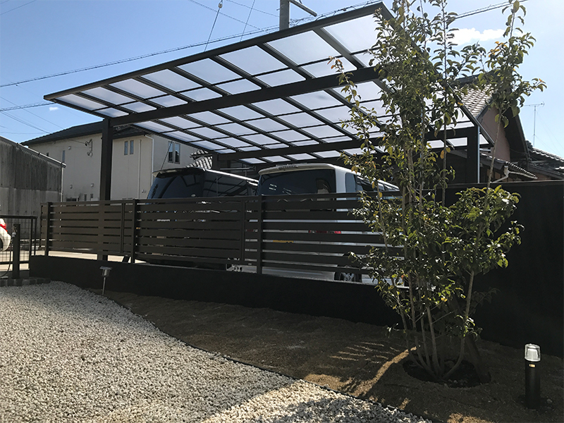 カーポート(YKK/エフルージュツイン 濡縁(三協アルミ) 目隠しフェンス(YKK/エクスラインフェンス) 門扉(YKK/エクスライン門扉) 門柱笠置(タカショー/エバーアートウッド)