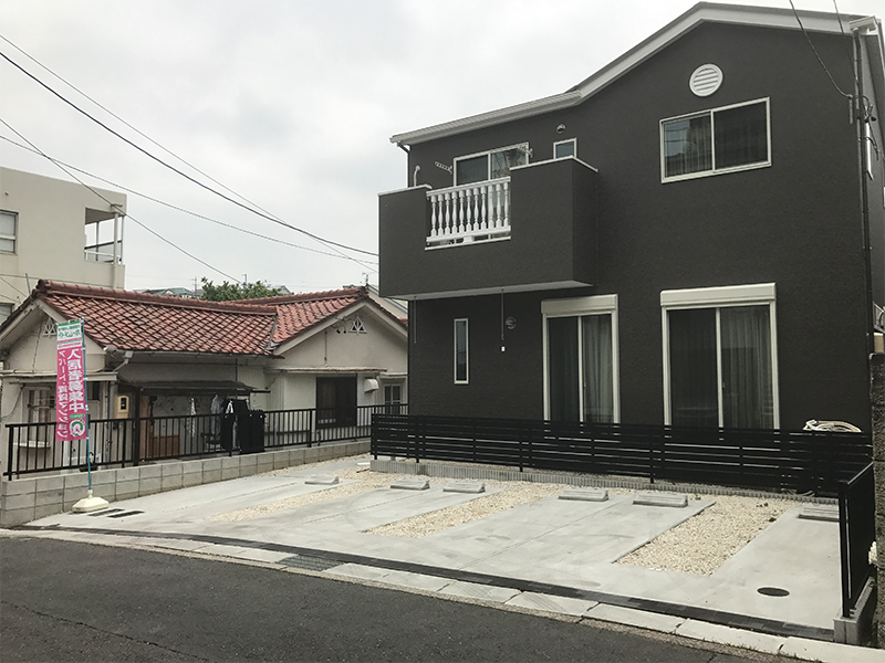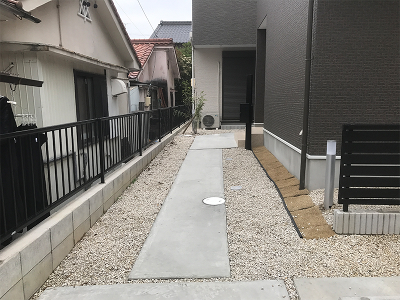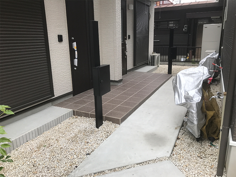 基礎巾木塗り・内外タイル工事・化粧CBを蹴上に使用したステップを施工し、その後、なるべくシンプルに必要最低限の外構工事。