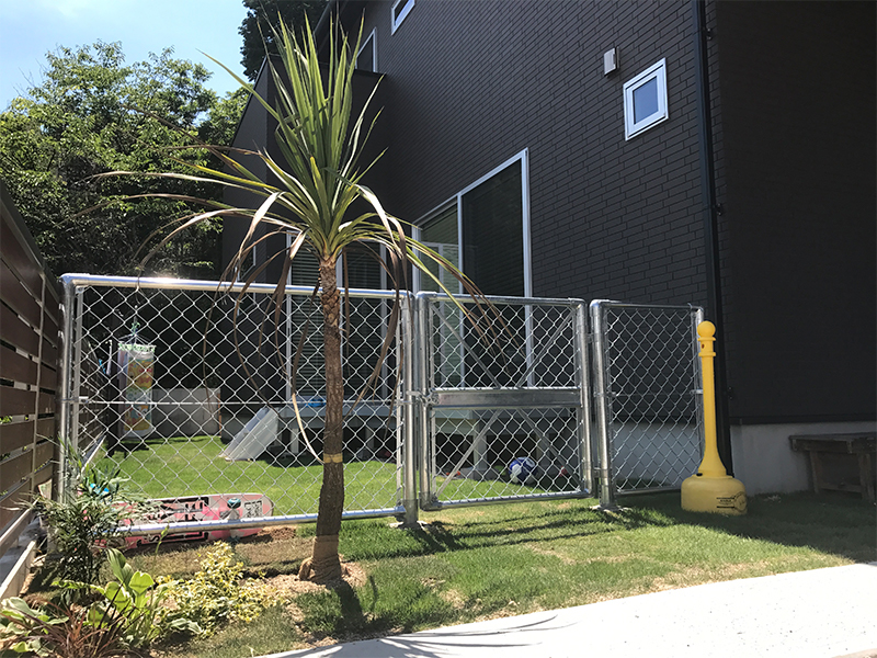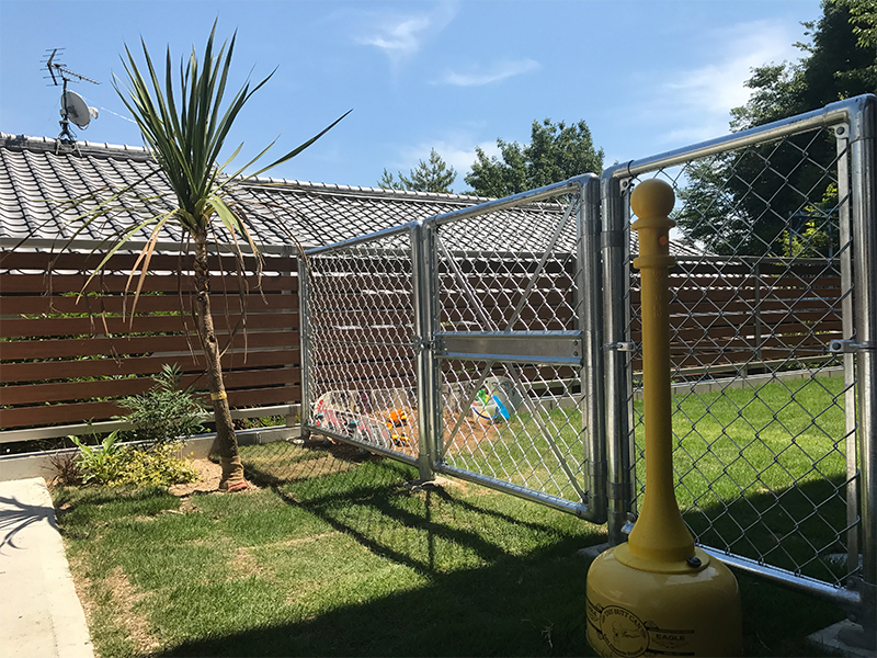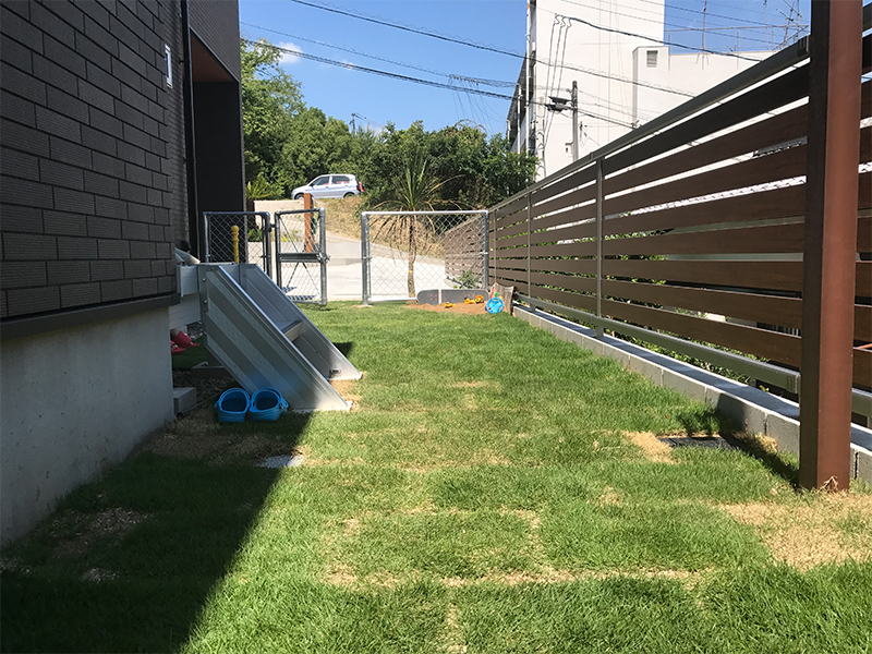 お子様の砂場を確保した際に、不要になったスケートボードやスノーボードの板で遊び心の演出をし、雰囲気満点のお庭となりました。