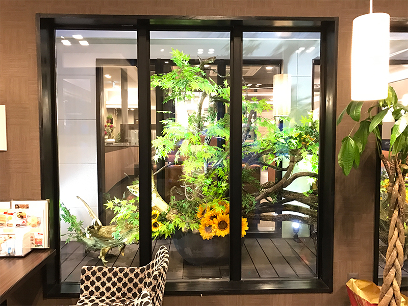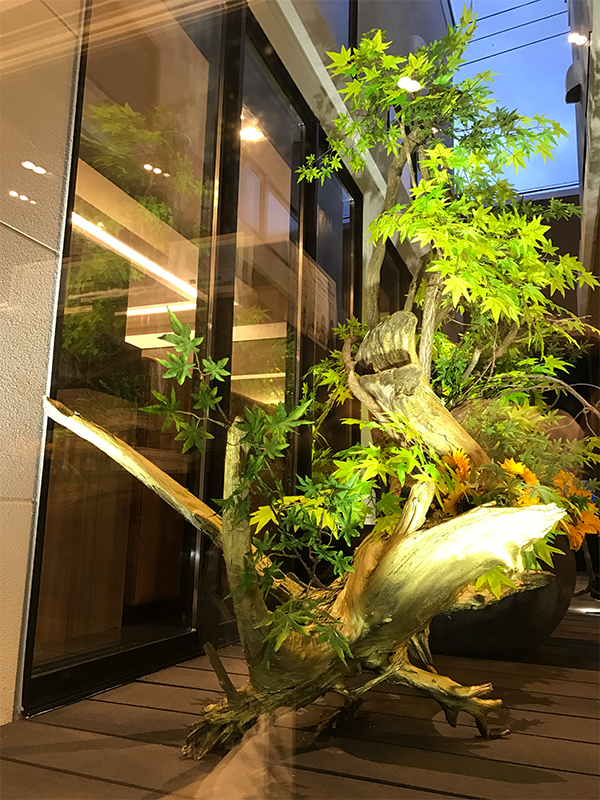 店舗内の一角にある、3面ガラス張りにて眺めれる坪庭空間に、人工ウッドデッキ+ライティングプランの施工をさせて頂きました。